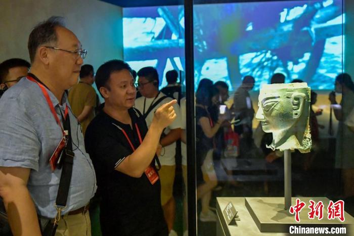 8月18日,四川德阳,参加2023年两岸关系研讨会的海峡两岸有关人士和专家学者参访四川广汉三星堆博物馆。图为三星堆博物馆的青铜人头像吸引海峡两岸有关人士和专家学者。 中新社记者刘忠俊摄