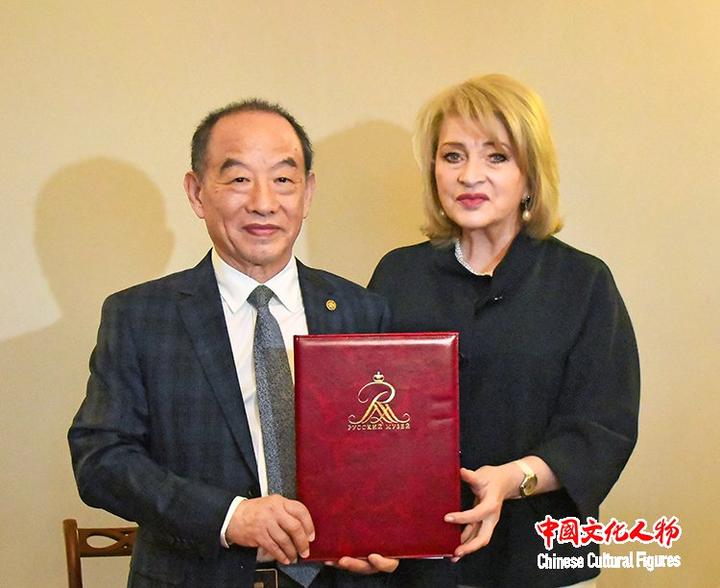 俄罗斯文化部前副部长、国家博物馆馆长阿拉·玛尼洛娃向韩玉臣颁发收藏证书