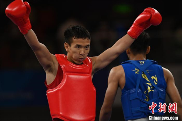 3日,在成都大运会武术项目散打男子60公斤级决赛中,中国选手马衣姑(左)夺得金牌。 中新社记者 张浪 摄