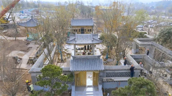 走近济南展园,由青砖灰瓦构筑起的济南传统建筑让人眼前一亮。主入口处,整齐的青石板路已经铺好,入口花墙也已基本完工,传统建筑垂花门伫立其间,静待开启。