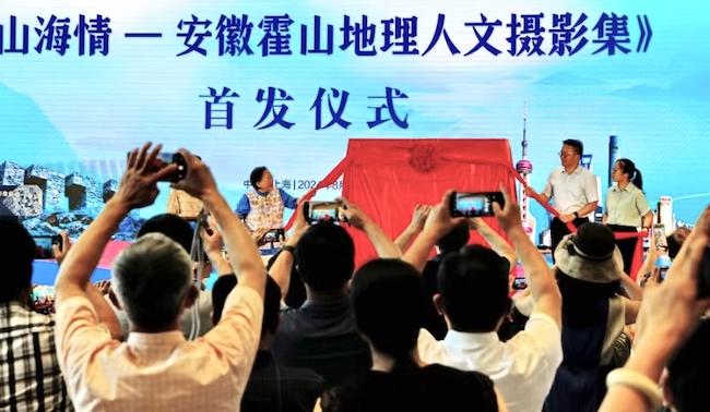 在展厅的重要位置,有两幅命名为“大别山云海”的作品。这是余慧文在安徽霍山拍摄的。过去一年间,余慧文多次到霍山采风,和当地摄影家一起研讨、创作,拍摄四季美景,记录老区发展。当地宣传部门将这些作品精选后集结成册,出版了《山海情——安徽霍山地理人文摄影画册》。画册的首发仪式在开幕式上举行。