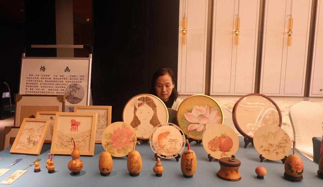 张氏烙画展台的作品同样令人印象深刻。桌面上,深浅不一的褐色图案栩栩如生,既蕴含国画勾、勒、点、染的独特韵味,又兼具西画的写实感与立体感。艺人介绍,烙画依托碳化原理创作,能够呈现出浮雕效果,堪称“中华一绝”;而张氏烙画因融入了国画技巧,才形成了如今独特的艺术魅力。