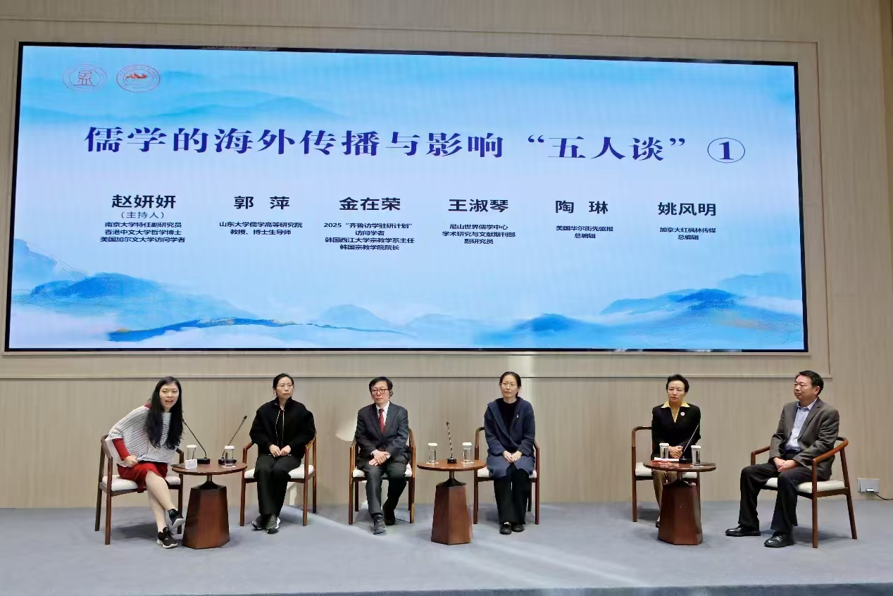 儒学的海外传播与影响“五人谈”分为两组,第一组由南京大学特任副研究员、香港中文大学哲学博士、美国加尔文大学访问学者赵妍妍主持,山东大学儒学高等研究院教授、博士生导师郭萍,2025“齐鲁访学驻研计划”访问学者、韩国西江大学宗教学系主任、韩国宗教学院院长金在荣,尼山世界儒学中心学术研究与文献期刊部副研究员王淑琴,美国华尔街先驱报总编辑陶琳,加拿大红枫林传媒总编辑姚风明担任访谈嘉宾。第二组由孔子研究院科研管理部助理研究员陈松博士主持, 2025“齐鲁访学驻研计划”驻研学者、山东大学儒学高等研究院学者、孙子研究院特聘教授Ilya A. Kanaev(汉伊理),2025“齐鲁访学驻研计划”访问学者、阿根廷科技研究委员会研究员、罗萨里奥国立大学教授Eduardo Daniel Oviedo(爱德华多·丹尼尔·奥维多),2025“齐鲁访学驻研计划”访问学者、韩国成均馆大学东亚学术院博士后研究员、韩国研究财团人文社会研究教授李诗然,韩国全国韩籍华人总联合会总会长、韩中新闻记者协会会长、韩国新华报社社长曹明权,西非统一商报副社长、西非暨尼日利亚中国和平统一促进会副会长、尼中友协副会长王淑华担任访谈嘉宾。