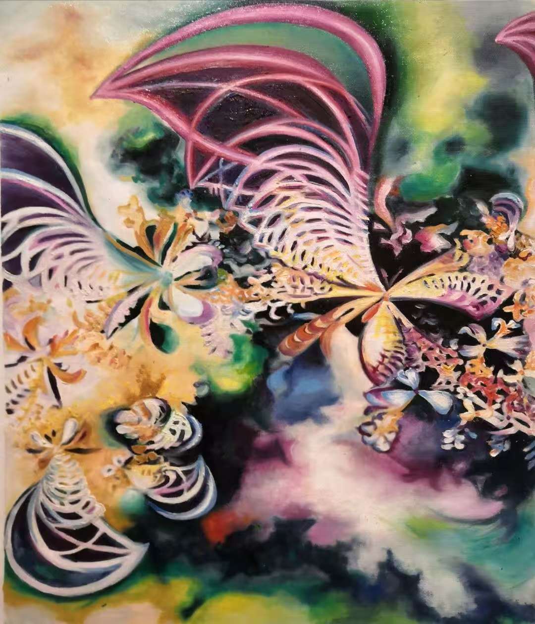 “符号化意象构建”则展现了她游走于具象与抽象之间的语言发明能力。《蝶恋花》系列中,传统花蝶形象被提炼为心理与哲学的象征单元,发展出一套具有内在逻辑的图像语法——花瓣的颤动被赋予心跳的象征,蝶翼的翻飞成为执念的隐喻。美国三藩市国际艺术家协会创会会长吴佰如认为:“她在抽象与具象之间找到了一条独立的表达路径,其图像不是再现,而是生成。”