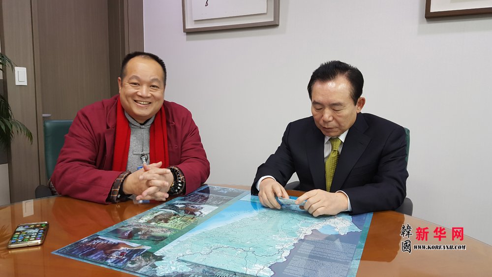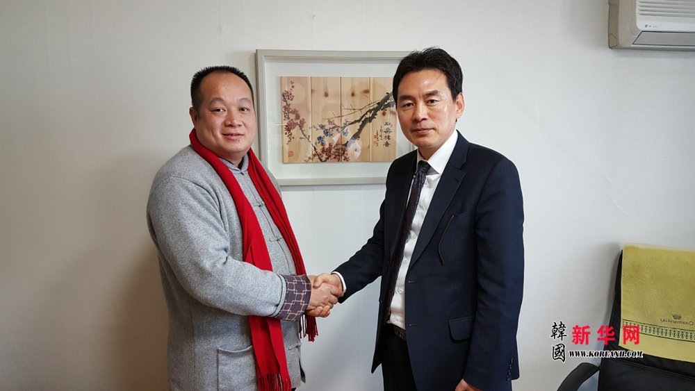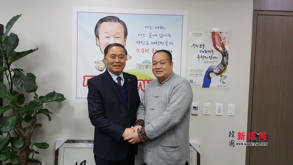 中国著名导演、海外华文新媒体合作委员会联合主席兼秘书长、韩国执政党中央委员会韩籍中国同胞专门委员会名誉委员长、韩国新华报业集团执行董事长陈俊余(右)同世界韩人商工总联合会对外协力委员长、中韩自由贸易(FTA)民间商贸促进发展委员会委员长金振兴(左)合影留念。
