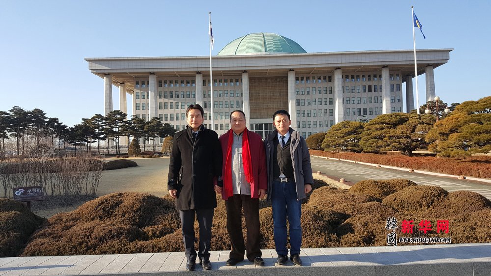 中国著名导演、海外华文新媒体合作委员会联合主席兼秘书长、韩国执政党中央委员会韩籍中国同胞专门委员会名誉委员长、韩国新华报业集团执行董事长陈俊余(中)、韩国执政党新国家党中央委员会中国同胞专门委员会委员长、韩国全国韩籍华人总联合会总会长、韩国新华报社社长曹明权(右一)、同韩国执政党新国家党中央委员会总干事朴京培(左一)在国会议事堂前合影留念。