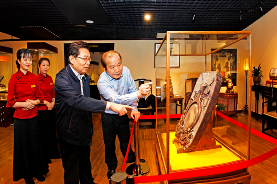 中宣部原秘书长、中国政研会副会长官景辉在中国工艺美术大师、中国文房四宝制砚艺术大师、中国文房四宝协会副会长梁佩阳的陪同下参观北京王府井工美大厦“紫云天工端砚艺术馆”