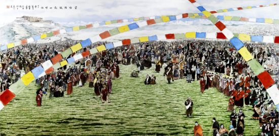 风还是那样的风,地还是那样的地。大经堂前的广场,那象征着蓝天、白云、红火、绿水、大地的五彩的经幡在风中飘动,啪啪的响声传入下面站着的人的耳中,一股股清新的草原的芳香在风中轻扬,看不见地落在人的身上。走进草原,我带着虔诚的心,在经幡下为你祈祷,经幡因虔诚而飘动,因飘动而灵验。我的心与经幡一起飞舞着。宁静安详的人们站在经幡下,喇嘛的鼓声、长号声、海螺声和所有信徒的“哦嘿嘿”声,汇成了一篇绝美的乐章…这就是画家林军的瓷板画《当经幡飘动的时候》。