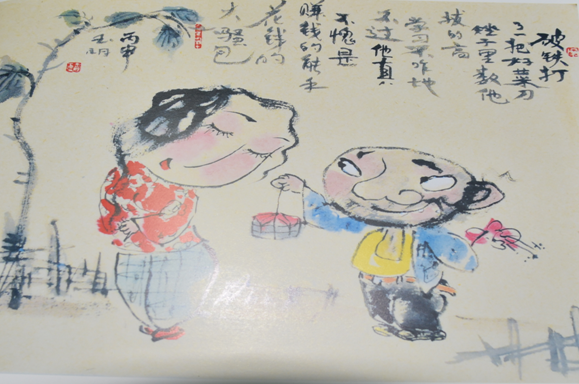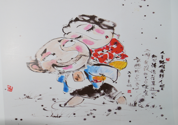 记者看到,宋玉明作品以“二叔、二婶”两个人物为主要形象,以东北顺口溜代表了传统的题画诗,“破铁打了一把好莱刀,矬子里数他拔的高,学习不咋地,不过他真不愧是赚钱的能手,花钱的大骚包”宋玉明说幽默是他创作的一个原则,他的画基本都是笑着画完的,所以他的画能让人开心。另一幅画作品“二叔”背着“二婶”,顺口溜则为“人生路难我找人背,知心话语往耳边吹,二婶我没想占便宜,就想吃点亏。宋玉明称,“二叔、二婶”没有具体原型,而是综合了故乡的人物特点,人物造型方面,宋玉明表示,“我画的二婶多数都很妩媚,我觉得女人妩媚点没什么不好。他的民俗画另外一个特色是不受年龄的限制,二叔可以以孩子甚至婴儿的形象出现在画面里,使画面充满了童趣,人物的很多语言和思维也是用孩子的身份表现出来,使画面更加活泼生动有趣,诙谐幽默,画面之中充满着真诚。