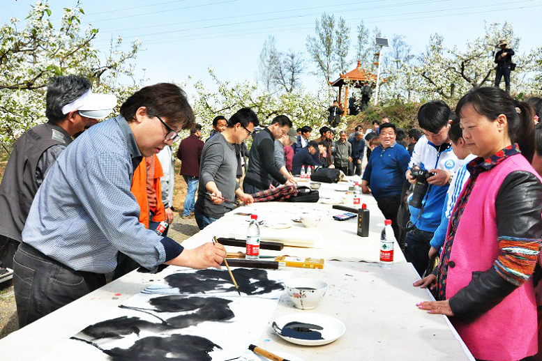 启动仪式期间,河南民盟书画院艺术家在马店镇采风并在梨园现场开展笔会。各路媒体记者、摄影家和书画艺术家们用各自方式展示梨园春色,宣传洛宁,宣传洛阳,宣传河南。(常艳)