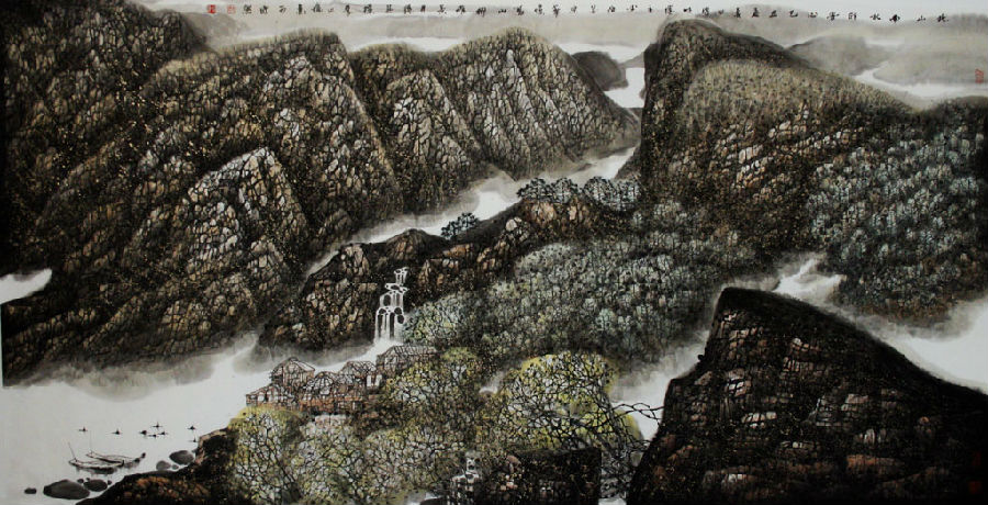 楊必位的藝術理念大緻基于這種思考,楊必位的山水畫創作走向,幾乎都循着從曆史文化的傳承走向現代語境的創新。在中國畫創作中,當前出現了多元而又散亂的局面,可謂“群雄并起”。然而,很多弄潮兒在藝術的探索中改變了中國畫的基因,改變了中國文化獨特的語彙系統,甚而改變了畫種的基本界線。楊必位在這方面卻非常冷靜、非常理智,他的齋号取爲“啞樓”可謂用心良苦,他要求自己“橫站”在“中西之間、古今之間”(吳冠中語)。在他的山水畫創作的探求中,做到與生活相應、與時代合拍、與自然共鳴。中國文化傳統中優秀的東西,他始終堅而持之,又将中國文化的内蘊與現代理念有機結合,強調文化、強調人格、強調精神,他一改過去丘陵田園小橋流水的甜潤風格,代之以巨制宏幅的峻山雄川,取正、取大、取實、取密、取雄強、取磅礴,從而讓自己的作品展現出一種全新的正大氣象。楊必位是一個人格特征極爲鮮明的學者型畫家,他在“啞樓”中一默如雷,筆傾千秋煙波、胸懷萬裏風雲。畫自然,更畫學問。他在《論社會多元發展對中國山水畫藝術生存力的影響》一文中說:“中國山水畫早在一千多年前就逐漸形成了獨立完整的畫種體系,南朝時由宗炳撰《畫山水序》,王微撰《叙畫》,謝赫著《古畫品錄》等一批論著的出現不但規範了山水畫的藝術品性,也爲山水畫的成功發展獲得了理論建樹。姚最的《續畫品錄》中的“咫尺之内,而瞻萬裏之遙,方寸之中,乃辨千尋之峻”已成爲曆代畫家闡釋中國山水畫精義要妙的重要依據。中國山水畫在悠長的藝術實踐過程中,綜合了孔子的仁學道德觀和莊子的虛靜道德思想,形成了“藝術爲人生修養之資,并作爲人格完成的境界”,把修養人生、享受人生作爲人生藝術追求的理想,并自覺地形成了具有中國特色的藝術精神的形式突變。中國畫那玄遠淡泊、天人合一的審美精神和哲學理念,從表象化的賦形美到内蘊式的詩性美,充盈着的濃郁的東方情韻,讓一代代的畫家癡迷地浸淫在對山水畫的不斷實踐與探索之中,并将山水畫的精神品性發展到“重境界”、“重格調”、“重品質”、“重人格表現”的崇高境地,并以唯美的藝術表達方式表達出中國的文化精神而爲中國文人世代相襲,鍾愛非凡的心理所依重,它直接影響了曆代畫家多樣化風格的創作實踐和深厚的理論探讨,推動着中國山水畫創作的不斷發展而至今未能消減。”楊必位又說:“部分畫家因受地域文化的局限而缺乏向外部世界及其他藝術門類學習借鑒的條件,視覺經驗未能得到充分的拓展,畫家的胸襟及創作思路未能産生質的超越,而過多地回味筆墨的精妙性則成爲制約畫家個性化創造力發揮的包袱。由于未能從前人所創造的語境中走出來,又缺少與現代相锲合的藝術表達語彙,緻使中國山水畫少了幾分與世界藝術相交、相聚的機會。”楊必位的論述缜密而又深度。由此觀之,楊必位走的是繼承創新、多元創新、開放創新的創作思路。他希望自己能在沉寂執著的藝術耕耘中去尋找一種更新的藝術語言來表達自己的内心的真誠感受,來發掘中國繪畫更強大的内在力量和外延能力。并孜孜不倦地追求着最能表達他那與時共進的情懷和心中的象外之象。