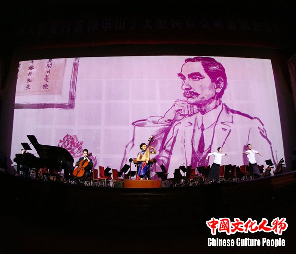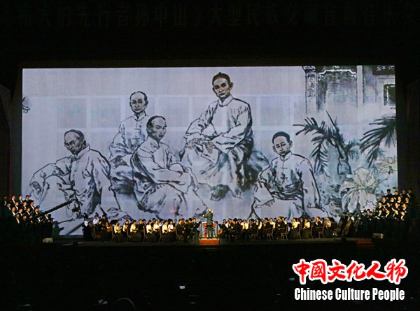 为纪念孙中山先生诞辰150周年,缅怀孙中山先生为民族独立、社会进步、人民幸福所建立的历史功勋,学习、继承和发扬孙中山先生的爱国精神、革命意志和进取精神,团结海内外中华儿女同心共圆振兴中华的“中国梦”,中央民族乐团根据全国政协委员、著名画家李延声创作的中国画百米长卷《伟大的先行者孙中山画卷》创作完成的大型民族交响音画音乐会《伟大的先行者孙中山》,于12月8日在北京人民大会堂成功演出。来自海内外的专家学者及艺术家和首都各界群众三千余人观看了大型民族交响音画《伟大的先行者孙中山》。