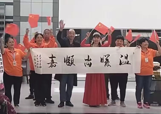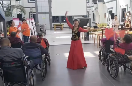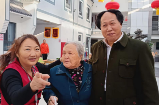 联欢会上,尚颐嘉养老院负责人刘茂德首先致辞,他总结了养老院建设取得的成绩与未来的发展目标,感谢各级领导和有关企事业单位的支持,祝愿养老院的长者们健康快乐。中国书法家协会的郭少宗老师在会上展示了他为养老院书写的墨宝:温暖尚颐嘉,表达了养老院入住老人和工作人员的共同心声。随着优美音乐的响起,入住老人代表和工作人员先后登台表演了歌舞节目,真诚的情感、精彩的演出,获得了阵阵热烈的掌声。黄小五老师在联欢会上演唱了多首熟悉动听的歌曲,受到了大家的欢迎。白雪老师表演的新疆舞用欢快的旋律、优美的舞姿,为大家带来了浓浓的西域民族风情。台上一人唱、台下众人合,精彩的节目把表演者与观众的心紧紧地联到了一起。当扮演毛主席的特型演员申丙电老师出现在联欢会现场后,“同志们好”、“主席好”、“同志们辛苦了”、“为人民服务”的声音此起彼伏,把联欢活动的热烈氛围推上了高潮。