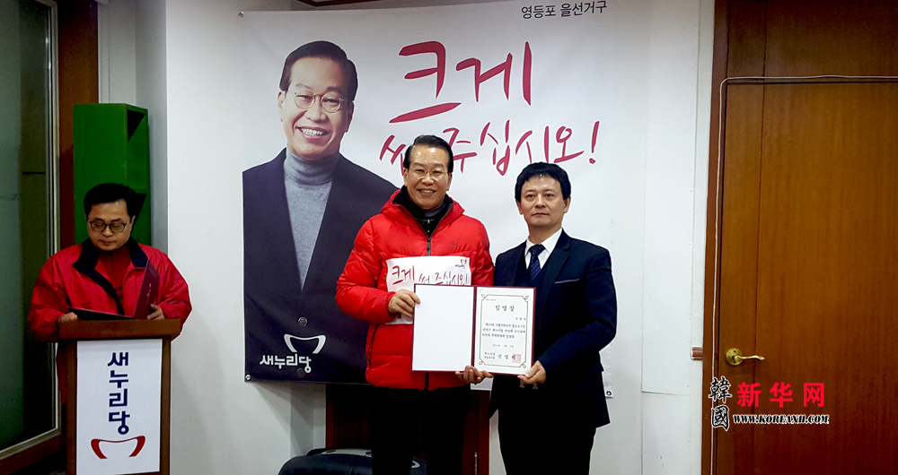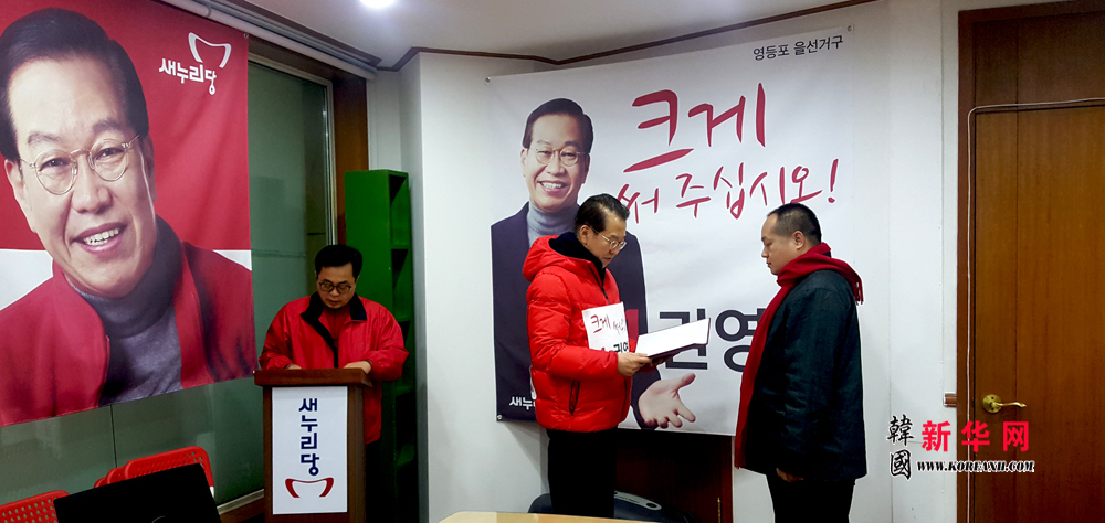 日前,在韩国执政党新国家党首尔永登浦区党部办公室会议室内,前大韩民国驻华大使、国会议员权宁世,以执政党新国家党1 号单一候补的名义竞选国会议员的身份,会见了前来拜访的中国著名的影视导演、韩执政党新国家党中国同胞专门委员会名誉委员长、海外华文新媒体合作委员会共同主席兼秘书长、韩国新华报业执行董事长陈俊余先生并为其颁发了特别顾问聘任状。