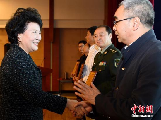 3月18日,国务院侨办2016年“文化中国·四海同春”工作总结大会在北京举行。国务院侨办主任裘援平向“文化中国·四海同春”参演艺术院团代表颁发纪念牌。 中新社记者 张勤 摄
