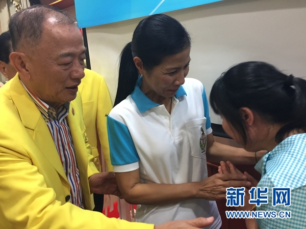 8月12日的“爱在泰国”活动上,泰国旅体部部长科甘(左二)与统促总会会长王志民(左一)向郑玖母亲表示慰问(右一)。(新华网记者 李颖摄)