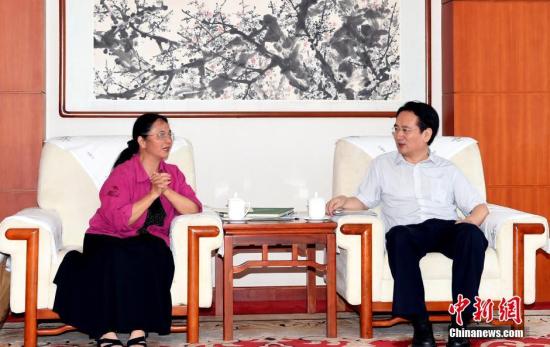 8月25日,中国国务院侨办副主任谭天星在北京会见美国华人文学专栏作家、美国华人收藏协会秘书长招思虹。中新社记者 张勤 摄