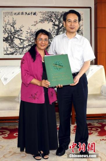 招思虹介绍了在美收集、捐赠文物的情况,并向侨办捐赠了1945年美国出版的《地图集兼地理词典》(Collier's World Atlasand Gazetteer)以及孙中山先生书信、签名等文物。