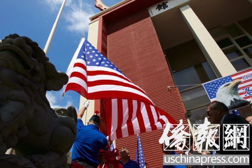 中华会馆门前升起美国国旗(邱晨摄)中国侨网7月6日电据美国《侨报》报道,7月4日美国独立日当天,成立超过120周年的洛杉矶(罗省)中华会馆举行了升旗仪式,现场退伍军