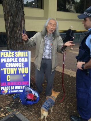 林丹尼及其引发争议的示威标语牌。据报道,悉尼前市议员、大马华裔林丹尼(DannyLim,音译)早前因为身背冒犯标语而被罚款500澳元。他拒绝缴交罚款,并在日前声称将会