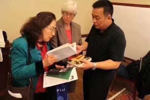 2011年,冰凌向耶鲁大学东亚语言文学系主任、讲座教授、国际著名汉学家孙康宜女士(左)、耶鲁大学东亚图书馆馆长韩爱伦女士(中)推荐中国作家的著作。