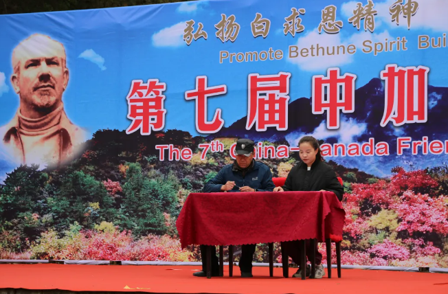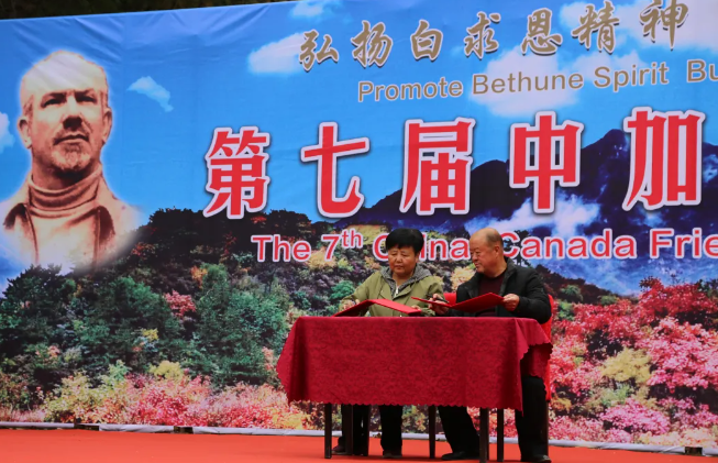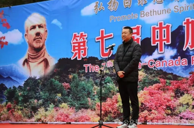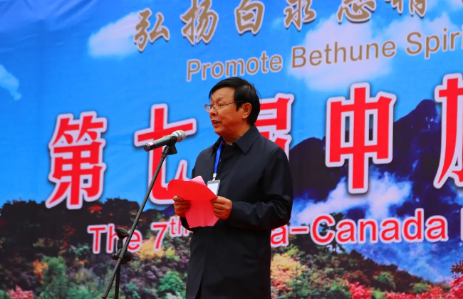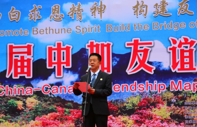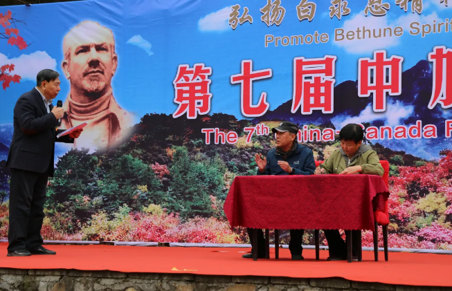 中国白求恩精神研究会执行会长陈天平首先代表主办方讲话。他指出:自2018年以来,“白银坨中加友谊枫叶节”已成功举办了六届。每一届尽管形式各异,内容不同,但主题始终如一,那就是以枫叶为媒,让海内外更多的人走进白银坨,走近白求恩,加强交流,增进友谊。自枫叶节举办以来,得到了中加政府和民间有识之士的高度赏识和青睐,关注度和参与度越来越高,特别是在白求恩的故乡,影响力和知名度也越来越大,来自加拿大政府、大使馆、加中友协的相关人员曾多次出席活动,加拿大总理特鲁多还曾专门发来贺信。可以说,“白银坨中加友谊枫叶节”已成为加强中加交流与了解的窗口,增进信任与合作的平台,深化两国人民友谊的见证和打造红色旅游国际化品牌的重要举措。
