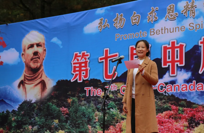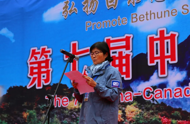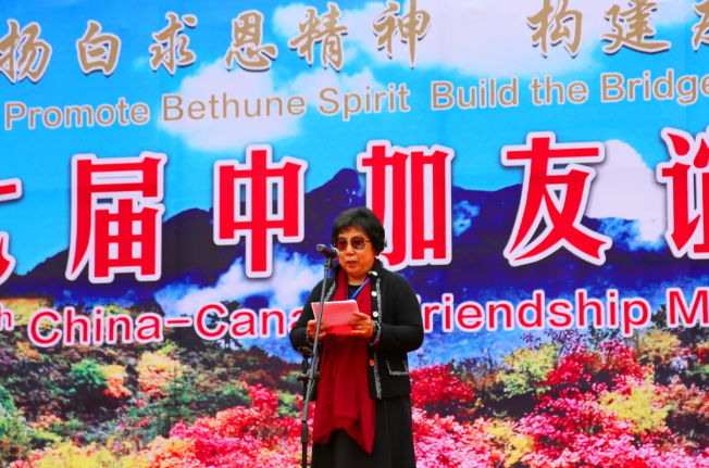 加拿大当代白求恩行动促进委员会会长马楠接着讲话,她深情回顾了白求恩大夫援华期间的光辉事迹,介绍了加拿大当代白求恩行动促进委员会成立以来开展活动的情况,最后表示要继续为推动广泛开展学习白求恩活动和增进中加友谊做贡献。