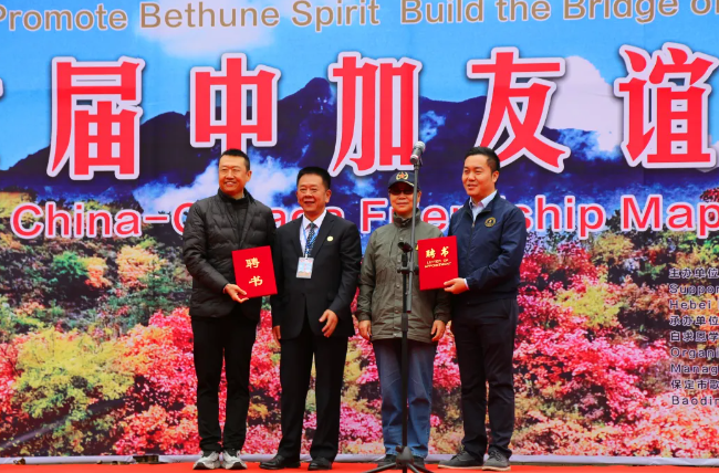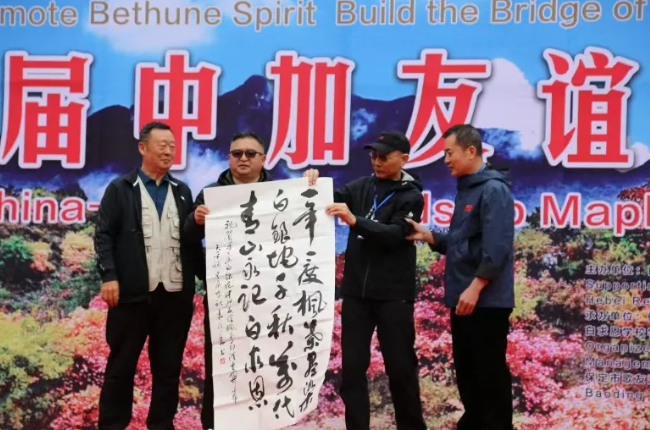 中国白求恩精神研究会原常务副会长兼秘书长蔡国军(右二)向活动承办方转赠了中国白求恩精神研究会老会长袁永林将军为本届枫叶节题写的书法贺词:一年一度枫叶尽染白银坨,千秋万代青山永记白求恩