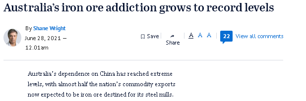 最新预测数据显示,本财年澳洲近一半的大宗商品出口将是铁矿石,这些商品大部分销往中国的钢铁厂。