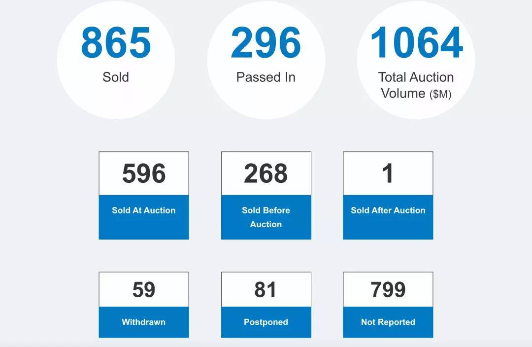 有865套房产成功售出,成交金额高达10.64亿澳元。其中,596套房产于拍卖中出售,268套房产在拍卖前成交,1套房产于拍卖后售出。