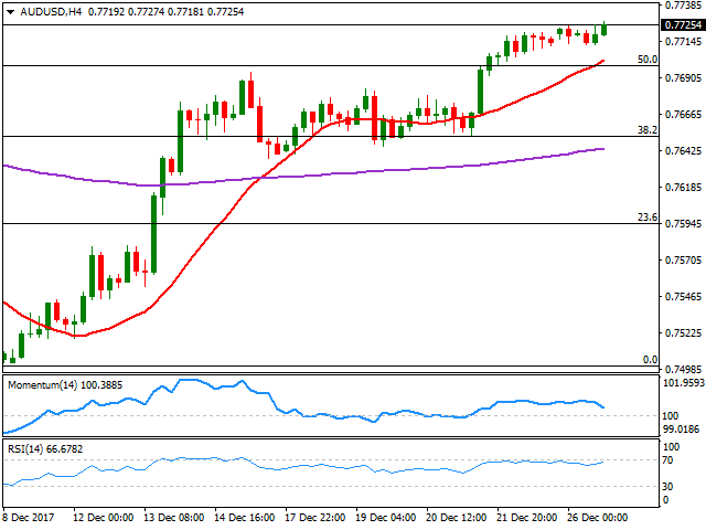澳元/美元自上周五收盘水平上涨10点,触及两个月高位0.7727,勉强收于该水平下方。全球股市走强,澳元获得支撑,金价和油价走强。澳大利亚将继长假后开市,但经济数据维持清淡。澳元/美元维持在10月/12月下降趋势50%回档位上方,0.7695为支撑位。阻力处在同一下降趋势的61.8%回档位0.7745附近。4小时图显示看涨的20SMA与斐波位交汇,同时相对强弱指标温和朝北,目前维持在66附近,所有信号表明汇价尽管过去数个交易时段交投清淡,看涨动能有限,但仍有望进一步上涨。