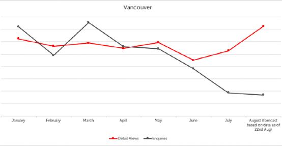 居外网北美地区负责人Matthew Moore先生说,网站上华人买家对温哥华地区房源的查询量在7月以及8月分别上涨了17%和37%,这是今年以来首次连续两月查询次数上升。一种可能的 解释是,媒体对英属哥伦比亚省增收外国购房者税率的报道实际上提升了华人买家对温哥华房产的关注度。数据同时也显示,华人买家通过电话、邮件、微信等渠道 与居外客服人员咨询温哥华房源的行为在7月和8两月分别下降了 51% 和8%,显示更多买家持观望态度,坐等市场调整结束。而8月以来中国买家针对多伦多房源所作的咨询,已比上月增长接近50%。