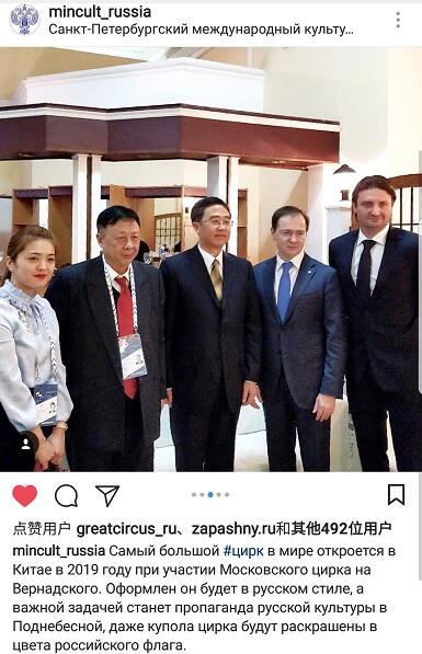 中俄最大旅游文化合作项目世界最大马戏城项目得到了俄罗斯联邦国家文化部和中国湖南省、张家界市领导的高度重视和支持,去年合作双方应邀参加了第五届圣彼得堡国际文化论坛,俄罗斯联邦文化部部长弗拉基米尔·梅津斯基、副部长亚历山大·茹拉夫斯基在论坛上了解了项目情况,期待项目早日建成。