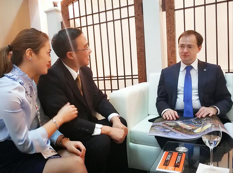 俄罗斯联邦文化部部长弗拉基米尔·梅津斯基(右)接见张家界常务副市长罗智斌(中),