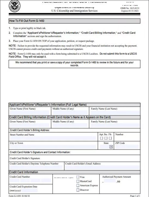 其中,使用维萨卡(Visa)、万事达卡(MasterCard)、美国运通卡(American Express)或者发现卡(Discover)支付申请费的申请人需要填写G-1450表(信用卡支付授权表)。