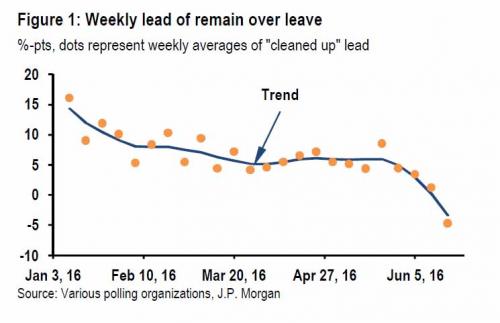正如摩根大通在昨天指出的,“英国下周退出欧盟公投前的民意调查显示英国退出欧盟向前再次迈进一大步。当前支持退出欧盟的人数比支持留在欧盟的人多3-5%。”