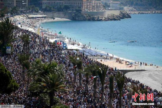 当地时间2016年7月18日,法国尼斯,大量民众聚集在“英国人漫步大道”,为此前在恐袭案中遇难的人们默哀。