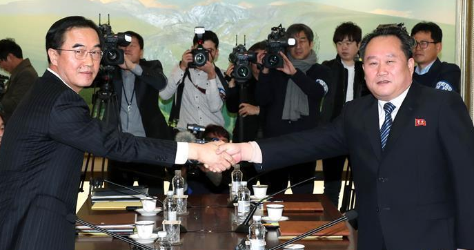 1月9日,韩方代表团团长、统一部长官赵明均(左)和朝方代表团团长、朝鲜祖国和平统一委员会委员长李善权在板门店韩方一侧“和平之家”握手。当地时间9日10时(北京时