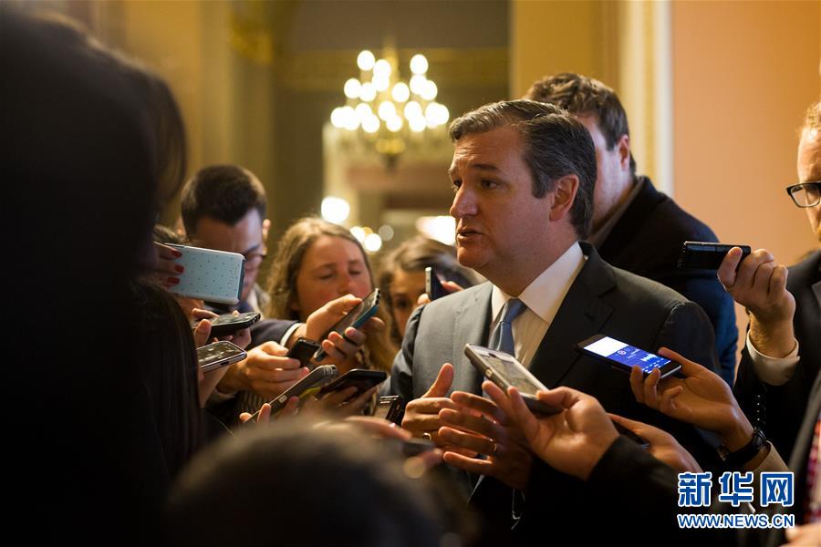 7月13日,在美国华盛顿国会山,参议员克鲁兹出席会议后被记者包围。美国参议院13日公布了修订后的新医保法案,以求弥合共和党内部分歧,使法案尽快通过。新华社发(沈霆摄)