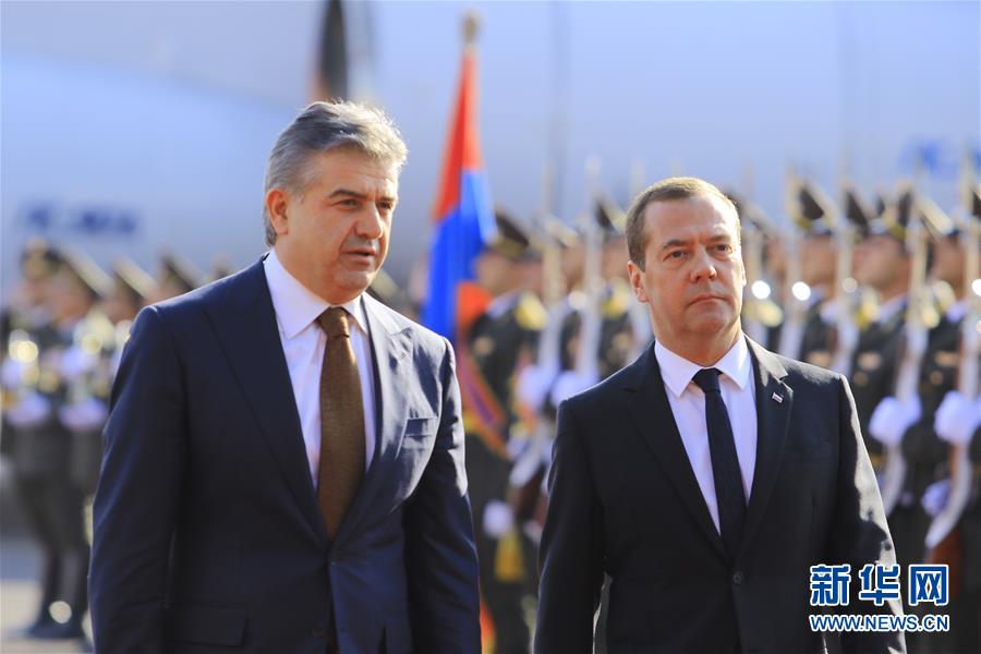 10月24日,在亚美尼亚埃里温,亚美尼亚总理卡拉佩强(左)欢迎到访的俄罗斯总理梅德韦杰夫。正在亚美尼亚访问的俄罗斯总理梅德韦杰夫24日表示,俄罗斯将在2018年继续以优惠价格向亚美尼亚提供天然气。 新华社发(格扎拉扬摄)