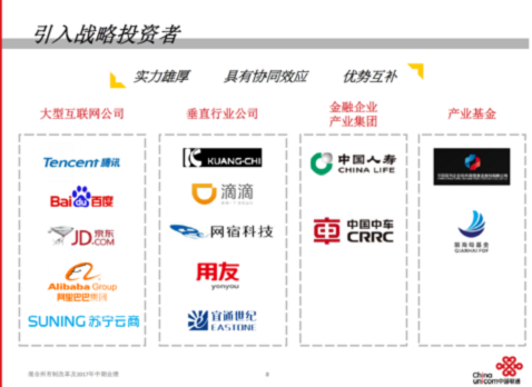 中国联通在今年8月20日公布了其混合所有制改革方案,引入其他国有资本和非国有资本,构建有效制衡的公司法人治理结构,完善市场化的激励约束机制,推动产业链、价值链关键业务重组整合,提质增效、转型升级,推动国有资本和非国有资本相互促进、共同发展。