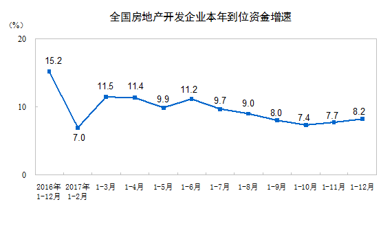 2017年,房地产开发企业到位资金156053亿元,比上年增长8.2%,增速比1-11月份提高0.5个百分点。其中,国内贷款25242亿元,增长17.3%;利用外资168亿元,增长19.8%;自筹资金50872亿元,增长3.5%;其他资金79770亿元,增长8.6%。在其他资金中,定金及预收款48694亿元,增长16.1%;个人按揭贷款23906亿元,下降2.0%。