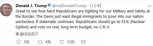 特朗普在推特上表示,“很高兴看到共和党人为了我们的军队和边境安全而奋斗,民主党人只是想让非法移民不经检查地进入我们的国家。如果僵局持续下去,共和党人应该使用51%(核选项)来处理长期预算。”