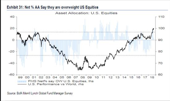 调查显示,美股仓位大降17个百分点至净超配4%;日本超过美国,成为投资者最青睐的市场,净超配18%。