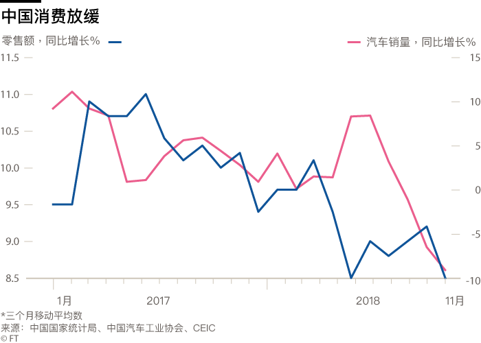 今年5月中国零售销售额增长创下历史新低,10月仍接近这一水平。汽车销量也大幅放缓。