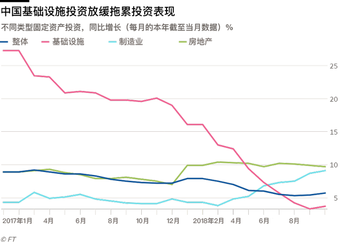2016年至2017年的基建热潮曾经帮助投资企稳,之后北京方面严格控制地方政府举债,公路、铁路和排污管道系统方面的支出随之放缓。