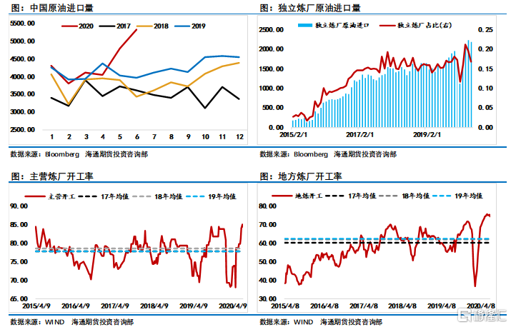 除了低油价的囤油,中国原油需求确实在突飞猛进地增长,不管是独立炼厂还是主营炼厂都在开足马力加工,炼厂开工率都达到了近几年的新高位置。开工率如此之高,与中国经济恢复有很大关系,同时也与前段时间炼油利润高有关。但最近我们看到,由于南方暴雨连连,柴油的炼油利润已经降至了近三年以来的新低,汽油利润从低点开始反弹,季节性回升比价明显。