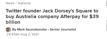 美国金融科技公司Square与澳洲公司Afterpay之间达成的交易2日上午被宣布,据悉,Square将以390亿元(澳元,下同)收购Afterpay。
