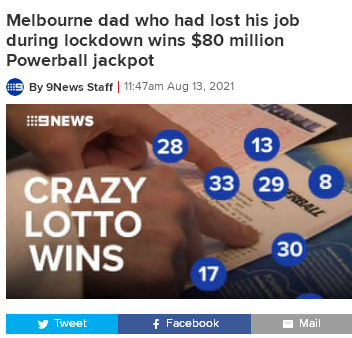 在12日强力球(Powerball)开奖后,一名曾在墨尔本第六次封锁期间失业的男子赢得了8000万澳元强力球头奖。