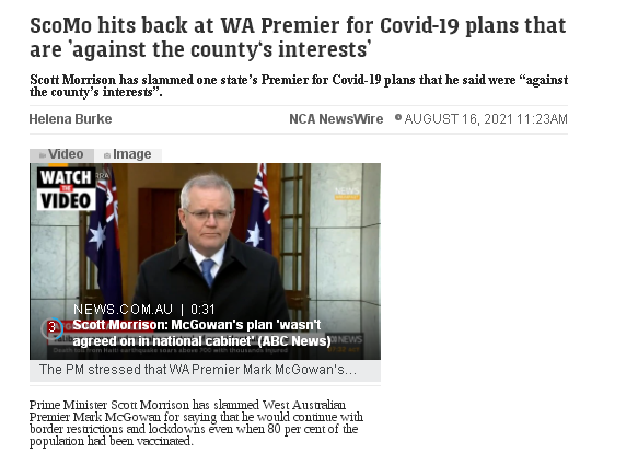 联邦总理莫里森(Scott Morrison)16日指责西澳州长麦高恩(Mark McGowan)80%疫苗接种率仍关闭边境的计划“违背了国家利益”,麦高恩对此予以了反驳。